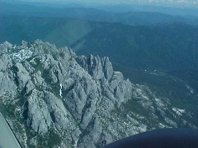 Were flying over Castle Crags now, this grey volcanic granite formation is much older than even Mt Shasta. Many tourist stay at the Railroad Park Inn off I5. They have the best views of Castle Crags and you can sleep in a comfortable remodled historic box car,