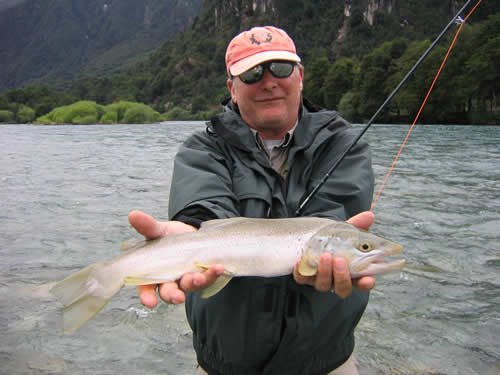 The next day we headed for the Lower Futaleufu and Henry caught this trout that reminded me of going to back to the 70`s, and watching my brother Tim listen to the records of that albino singer, Edgar Winter. Can anyone identify this trout? It’s part brown, part sea-run, (but up this high?) brook, who knows? None of us have ever seen a trout that looks like this one did any where? Which adds to the mystique of the Lower Futaleufu, Sizzlers! Maybe his name was Ian(inside family joke)?