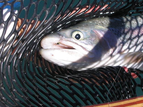 Meanwhile, I was with Lucia in a place called Sipper Cove, watching huge trout that laid near the surface taking emergers and dries. You could see them everywhere, but the big boys were right up against the bank. It was amazing! My heart started pounding cause in all my 14 years of guiding full-time, I had never seen anything like this! So many big trout that you could see so easily. Any expert would pick the best trout out like a pool shot in the corner pocket. So there I was with Lucia, on her last day with me. She had come to me as a beginner but with numerous catches over her total of 13 days, she had elevated her skills to an intermediate. I always say anybody can learn to fly fish, all you need is desire and opportunity, and these qualities she never lacked. So we rowed a little closer and one by one she caught the smaller and medium-sized trout that lined up like a feast at Glide Memorial Church in San Francisco, California.