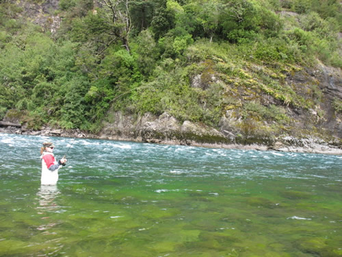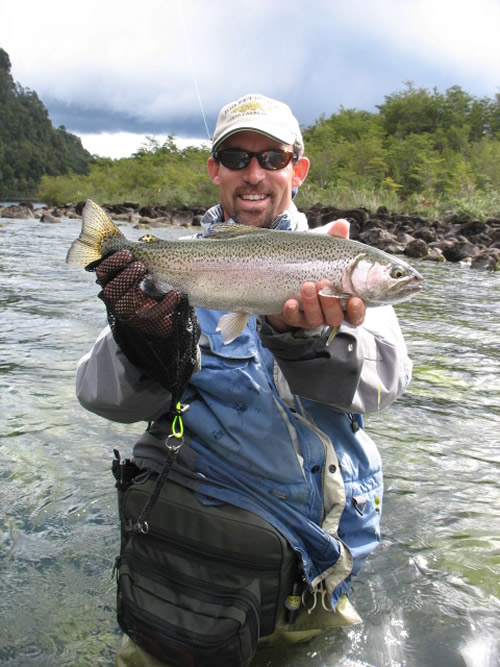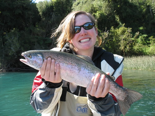 Lucia enjoyed her first day ever fly fishing by hooking into 9 trout and landing 7! The trout were very strong on the Rio Petrohue. This one in the picture took her down 150 yards into her backing over the next series of falls and was heading for the ocean the last we heard! I like the Rio Petrohue because the trout are so strong, and you can also catch steelhead and browns in the Lower Petrohue in which we drift in boats.