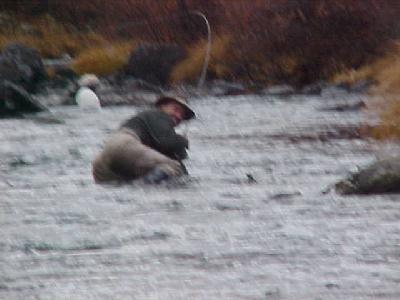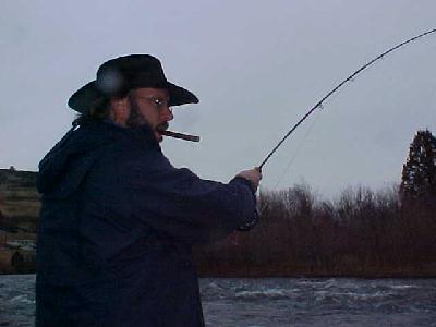 Ralph Tingle fighting a steelhead with a fine Cuban in his mouth. I really enjoy the smell of cigars out on the river, Ralph looks like Jessie James in this battle.jt