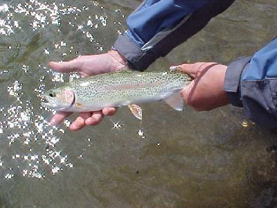 Nice Upper Sac Trout! These trout are different looking than our McCloud Rainbows mainly because of the natural camouflaging that goes on in the two rivers. The Upper Sac is more gin clear river with the kind of colors that are associated with granite rocks and sandy sediment structure, a classic freestone river. The McCloud is an example of a glacified spring creek that has a limestone and serpentine rock base. This river is kinda of a Spring creek that turns into a free stone river, The gacial silts from Mt Shasta make the tourquoise color you see in the Mccloud River and the trout are either darker or silver in looks.