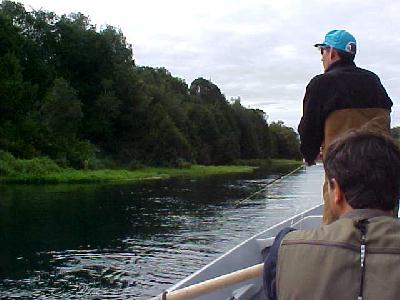 Francisco had Chris strip a big streamer on a 400 grain sink tip along the edges of the mossy shoreline. After about 1000 casts, it was appearant the hot sunny weather was putting the fish down. Francisco mentioned that after lunch,