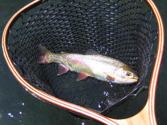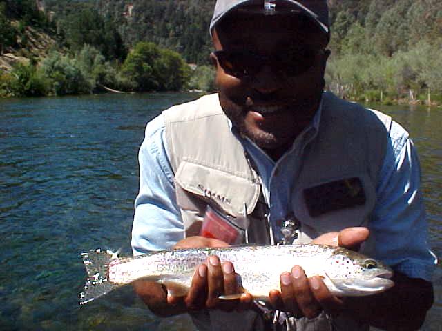One that didn’t get away. Adult steelhead caught on a 5 wt rod with 5X tippet size 20 midge on the Trinity River Thursday August 11,2005.