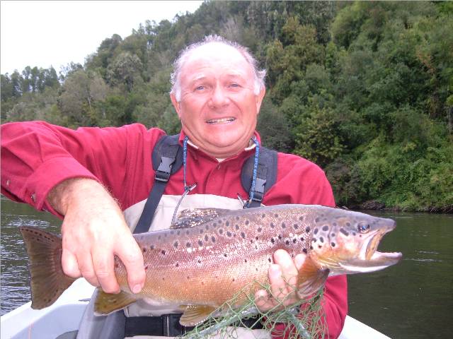 Back on the Rio Petrohue, Pancho’s home river, he nets a lunker brown trout for another customer!