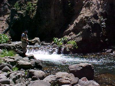 Hershel’s friend Gary seen here above with numerous trout practically chewing on Gary’s fly. The trout were really stacked up here because of the shady wall and oxgenated water. Gary progressed