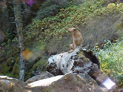 Shasta sitting on this log really loves hanging out at Middle Falls.