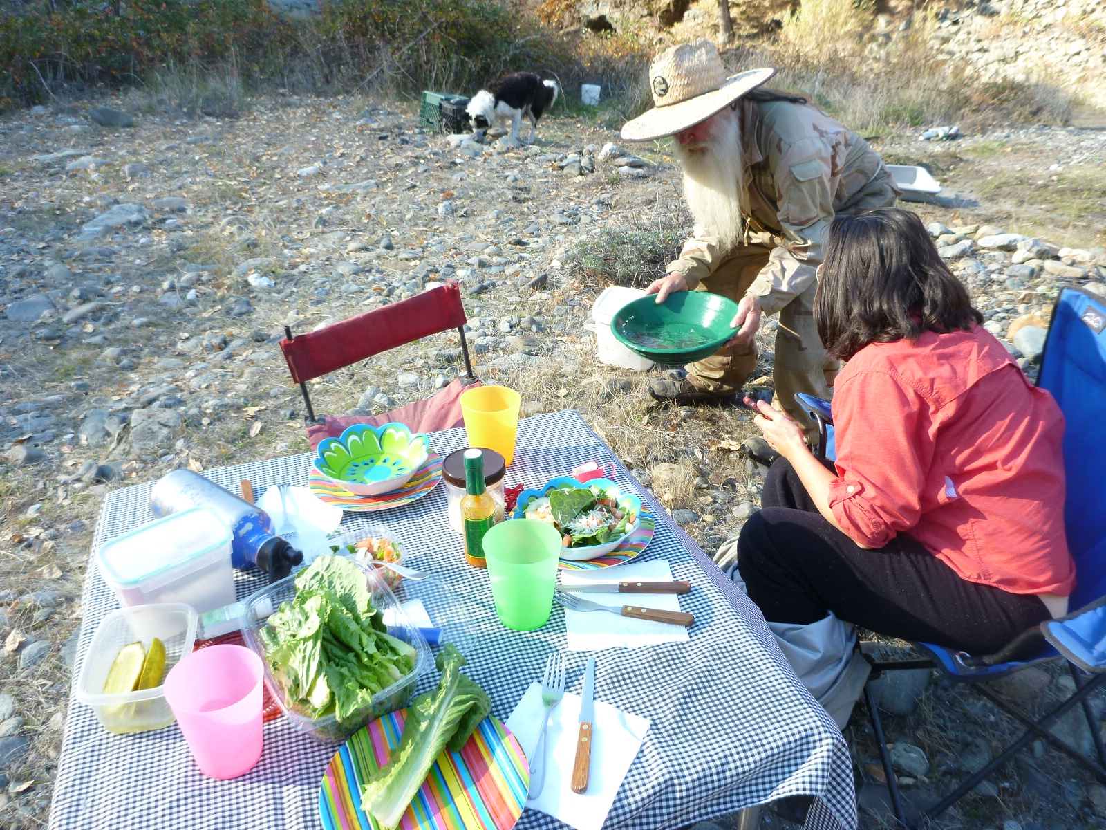 Then he left us and went back across the river in his kayak and we enjoyed Carola’s wonderful lunch, he thanked us again for the powdered donuts, left us cool rocks and waived goodbye. That was the most friendly miner I had ever met and he was from the Klamath River? I had bought 4 lamb shanks at Raley’s in Yreka earlier that morning and presented him with one for his dinner. He said, he doesn’t see a lot of lamb down that far in the canyon and thanked us again.