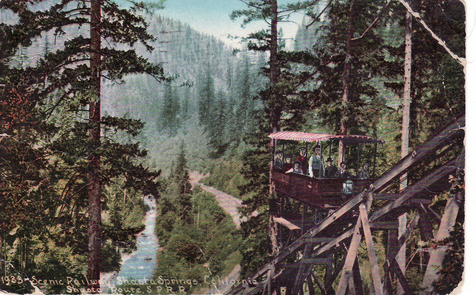 Now it’s time to step back in time and revisit the Shasta Springs Resort around 1908, they had this incredible lift up from the rail station to the resort located up on top of the hill.