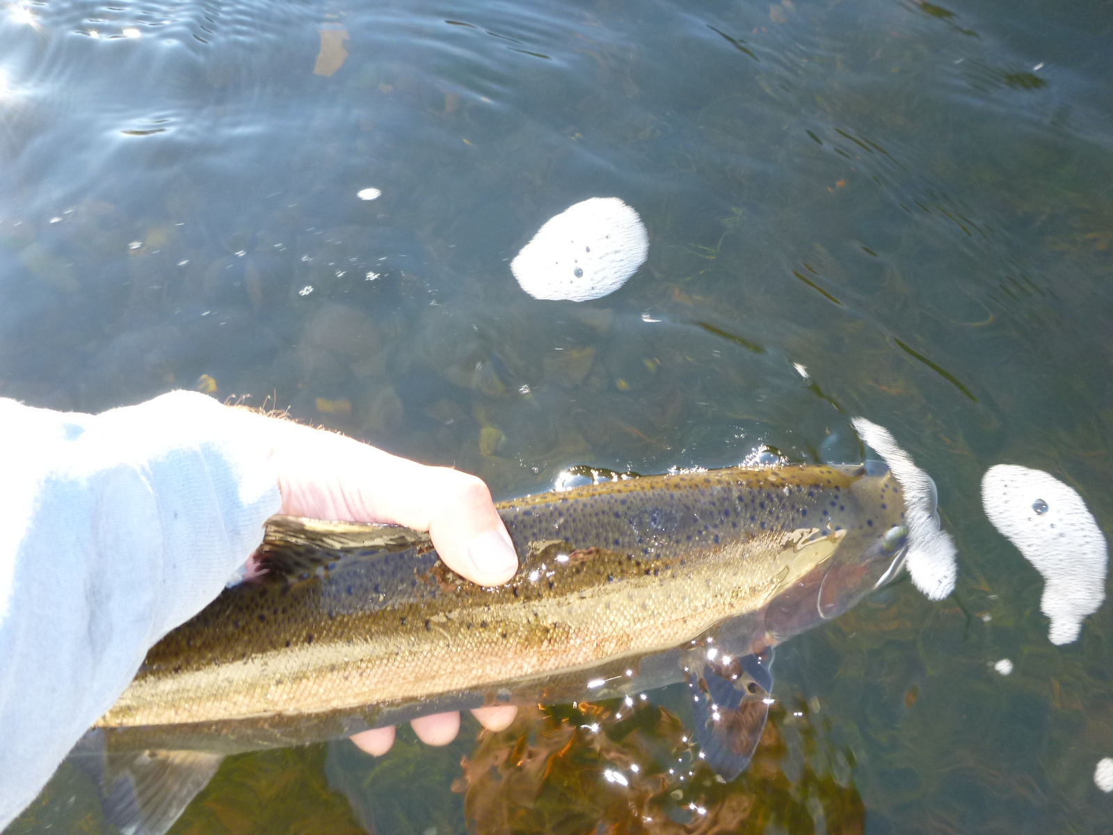 (Don’t need waders on the warmer days, you don’t want to wade in the river and harm the salmon eggs trying to produce the next generation of fish.)