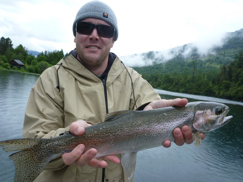 Next we took Shane to a private ranch we have access to on the Rio Maullin and while I was launching the boat he hooked into a nice trout.