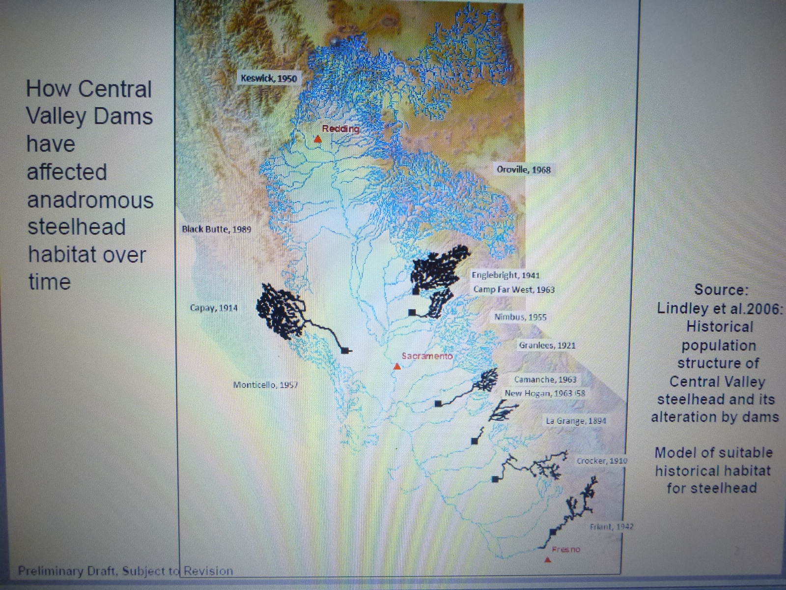 Now here’s the past in blue and black represents modern day and what has been lost due to dams, about 80 to 90% habitat loss. It’s brutal people and with the dry years we’ve been having and low water in the Central Valley, we might have to really see what we could do for our future generations of anadromous fish that inhabit the Sacramento River. Good grief, that black map looks like a fricking bowling lane, no wonder they are on the decline.