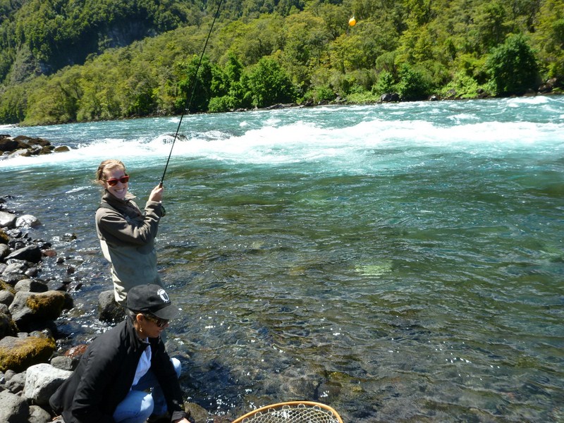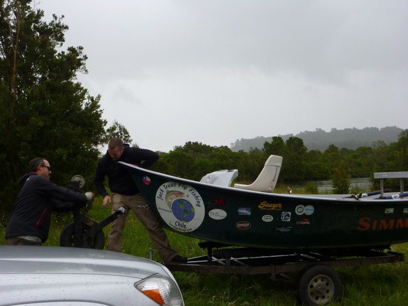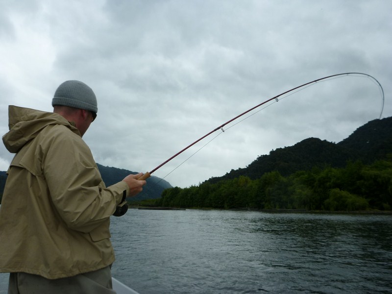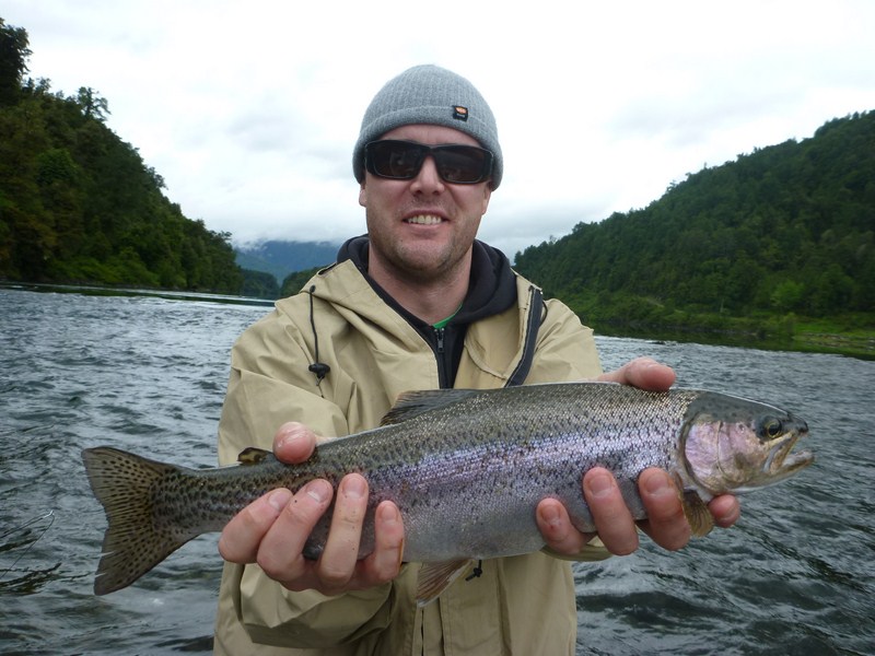 Next we took Shane to a private ranch we have access to on the Rio Maullin and while I was launching the boat he hooked into a nice trout.
